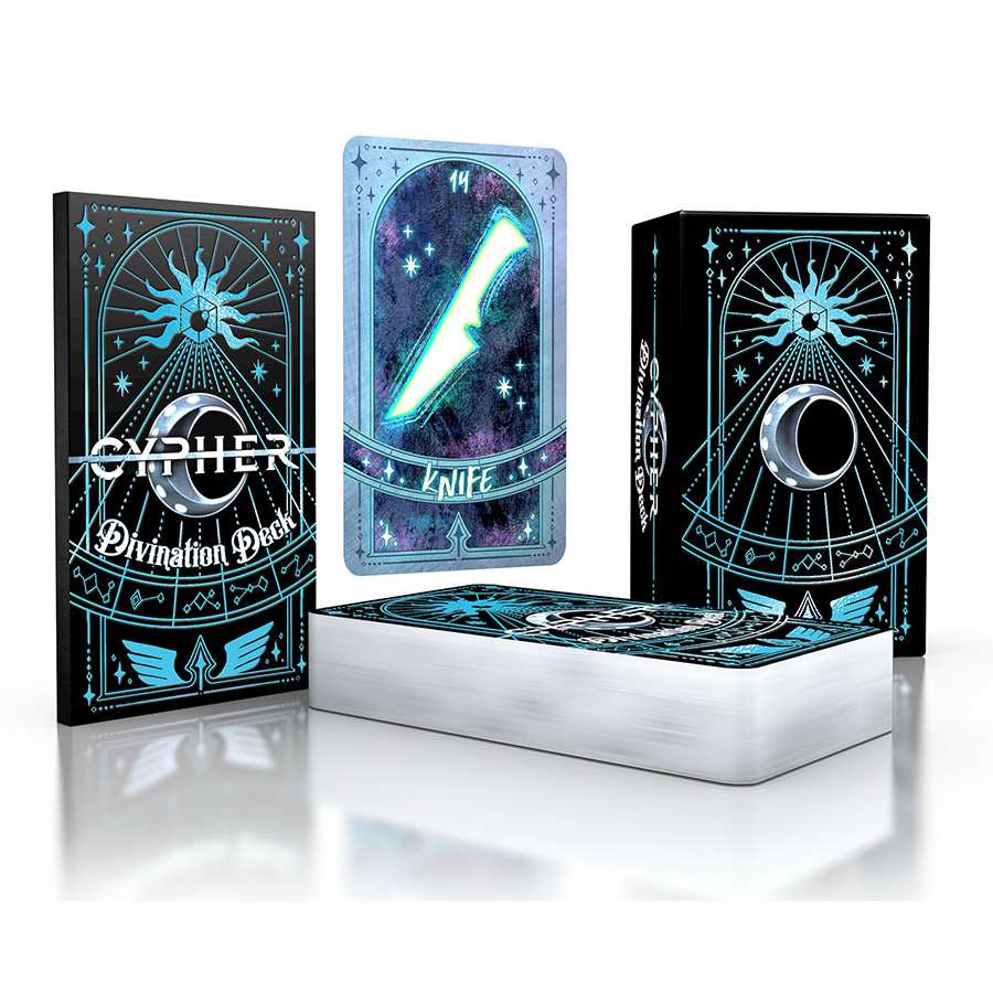 The 50 oversized cards of this deck each feature a divinatory image that inspires all sorts of ideas on the fly. Draw the Raven? It’s a bad omen in the game, but the accompanying booklet also ties it to a cypher, a manifest cypher, a GM intrusion idea, an NPC, a creature, an asset for a player, a trait for an NPC, an interesting event, and even the upcoming weather. Tarot-sized and packaged in a durable, attractive box, this deck can be used as an in-game prop, an aid for the GM, or both at once. It’s an awesome source of inspiration and ideas while running or in prep—yet another way Cypher helps you make the most of your imagination!