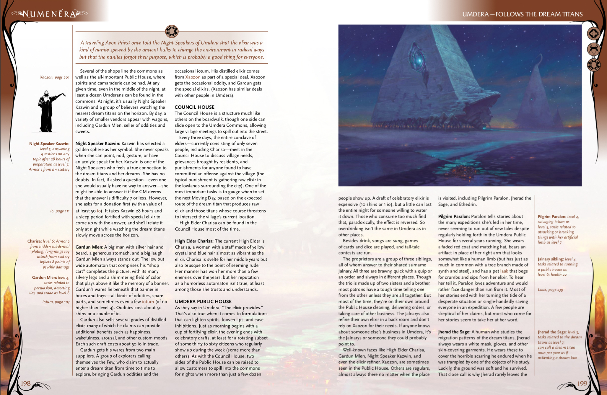 Open up any Numenera product and you’ll see that we spend a lot of time designing and laying out our books to provide something that’s not only pleasing to the eye, but also immediately useful for reference. If a topic mentioned in the main text is touched on elsewhere in the book (or another book), we highlight that text and provide a specific page reference in the margin. These margin “callouts” might also offer additional thoughts, related content, or sometimes even visual information helpful for the GM. Take a look at a couple spreads below, and you’ll see what I mean.
